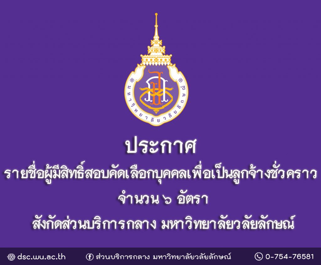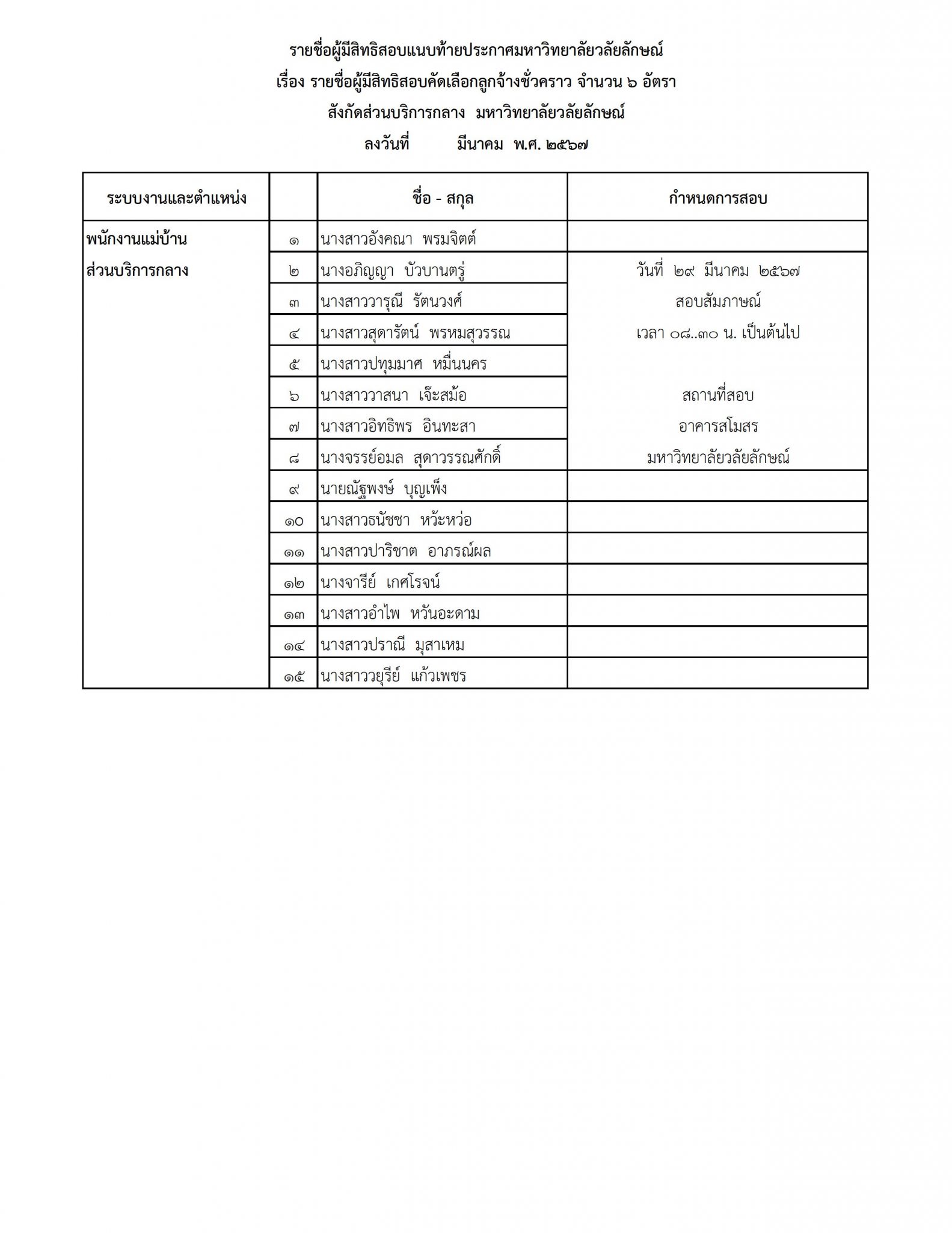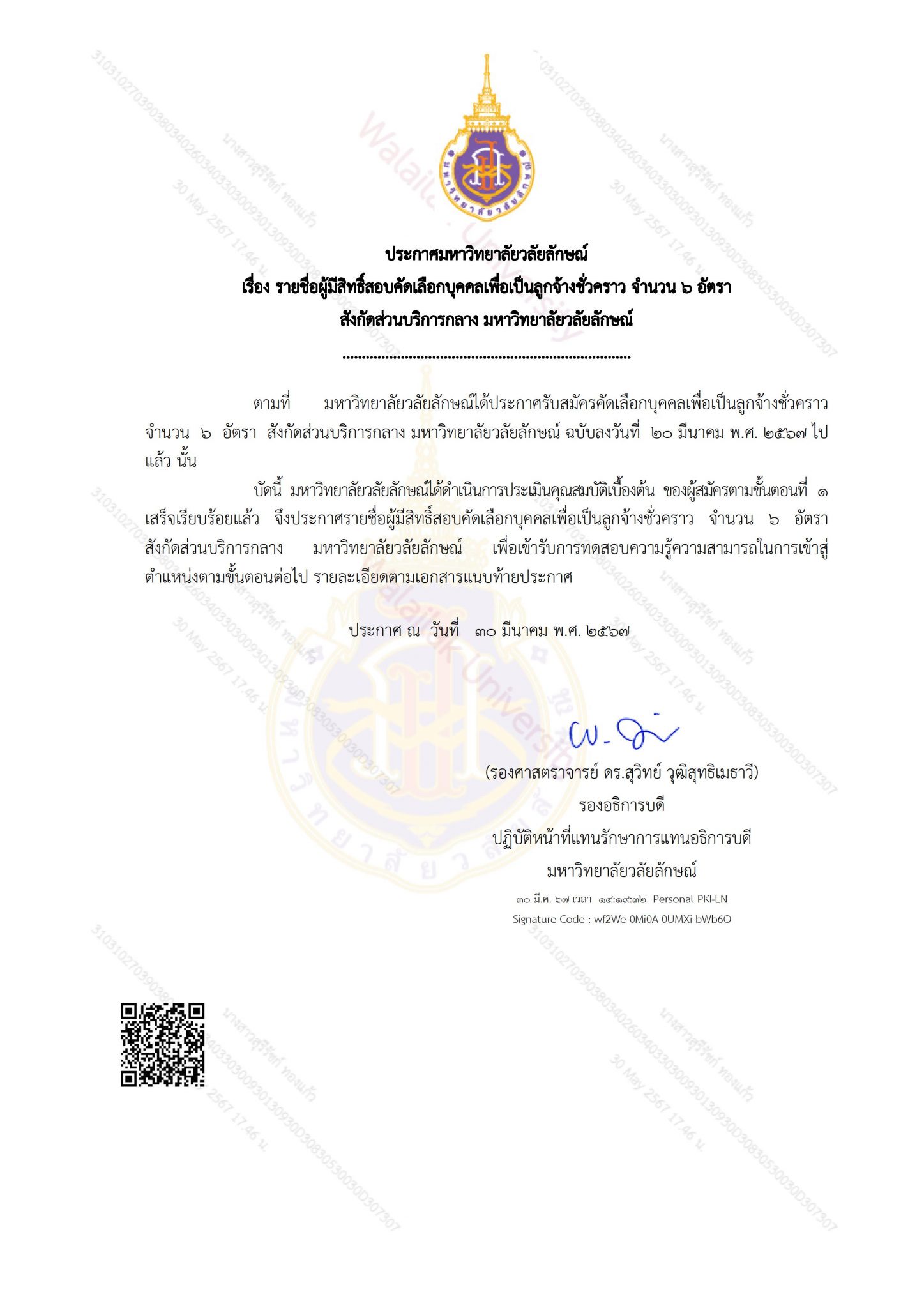 ประกาศรายชื่อผู้มีสิทธิ์สอบคัดเลือกบุคคลเพื่อเป็นลูกจ้างชั่วคราว จำนวน ๖ อัตรา สังกัดส่วนบริการกลาง มหาวิทยาลัยวลัยลักษณ์ / ประชาสัมพันธ์ / By Alongkorn Anusak ประกาศมหาวิทยาลัยวลัยลักษณ์เรื่อง รายชื่อผู้มีสิทธิ์สอบคัดเลือกบุคคลเพื่อเป็นลูกจ้างชั่วคราว จำนวน ๖ อัตราสังกัดส่วนบริการกลาง มหาวิทยาลัยวลัยลักษณ์……………………………………………………………….. ตามที่ มหาวิทยาลัยวลัยลักษณ์ได้ประกาศรับสมัครคัดเลือกบุคคลเพื่อเป็นลูกจ้างชั่วคราวจำนวน ๖ อัตรา สังกัดส่วนบริการกลาง มหาวิทยาลัยวลัยลักษณ์ ฉบับลงวันที่ ๒๐ มีนาคม พ.ศ. ๒๕๖๗ ไปแล้ว นั้น บัดนี้ มหาวิทยาลัยวลัยลักษณ์ได้ดำเนินการประเมินคุณสมบัติเบื้องต้น ของผู้สมัครตามขั้นตอนที่ ๑ เสร็จเรียบร้อยแล้ว จึงประกาศรายชื่อผู้มีสิทธิ์สอบคัดเลือกบุคคลเพื่อเป็นลูกจ้างชั่วคราว จำนวน ๖ อัตรา สังกัดส่วนบริการกลาง มหาวิทยาลัยวลัยลักษณ์ เพื่อเข้ารับการทดสอบความรู้ความสามารถในการเข้าสู่ตำแหน่งตามขั้นตอนต่อไป รายละเอียดตามเอกสารแนบท้ายประกาศประกาศ ณ วันที่ ๓๐ มีนาคม พ.ศ. ๒๕๖๗ Facebook Comments Box Post Views: 166