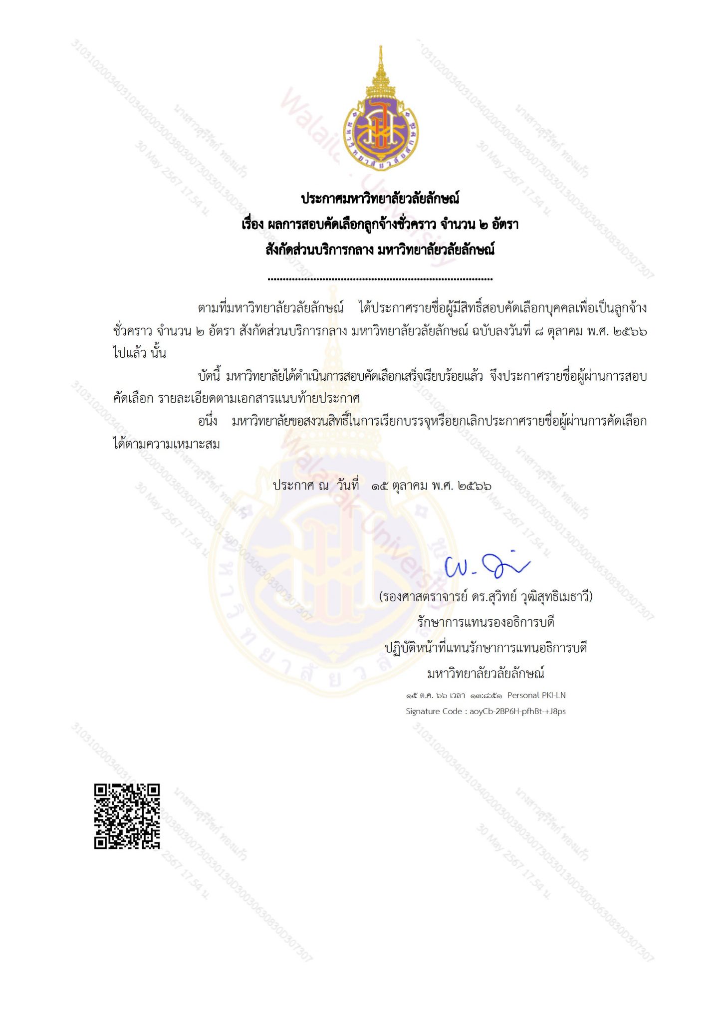 ผลการสอบคัดเลือกลูกจ้างชั่วคราว จำนวน ๒ อัตรา / ประชาสัมพันธ์ / By Alongkorn Anusak ประกาศมหาวิทยาลัยวลัยลักษณ์เรื่อง ผลการสอบคัดเลือกลูกจ้างชั่วคราว จำนวน ๒ อัตราสังกัดส่วนบริการกลาง มหาวิทยาลัยวลัยลักษณ์……………………………………………………………….. ตามที่มหาวิทยาลัยวลัยลักษณ์ ได้ประกาศรายชื่อผู้มีสิทธิ์สอบคัดเลือกบุคคลเพื่อเป็นลูกจ้างชั่วคราว จำนวน ๒ อัตรา สังกัดส่วนบริการกลาง มหาวิทยาลัยวลัยลักษณ์ ฉบับลงวันที่ ๘ ตุลาคม พ.ศ. ๒๕๖๖ ไปแล้ว นั้น บัดนี้ มหาวิทยาลัยได้ดำเนินการสอบคัดเลือกเสร็จเรียบร้อยแล้ว จึงประกาศรายชื่อผู้ผ่านการสอบคัดเลือก รายละเอียดตามเอกสารแนบท้ายประกาศ อนึ่ง มหาวิทยาลัยขอสงวนสิทธิ์ในการเรียกบรรจุหรือยกเลิกประกาศรายชื่อผู้ผ่านการคัดเลือกได้ตามความเหมาะสม ประกาศ ณ วันที่ ๑๕ ตุลาคม พ.ศ. ๒๕๖๖ Facebook Comments Box Post Views: 101