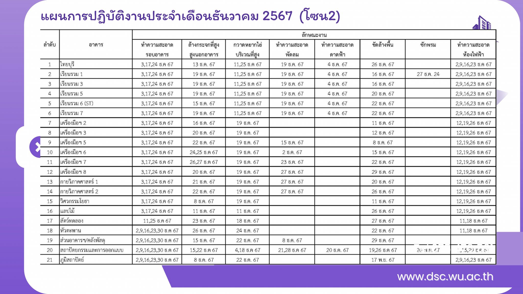 แผนการปฏิบัติงานบริการทําความสะอาด ประจําเดือนธันวาคม 2567 / งานทำความสะอาดและบริการทั่วไป, ประชาสัมพันธ์ / By Alongkorn Anusak ดาวน์โหลดไฟล์ Facebook Comments Box Post Views: 274